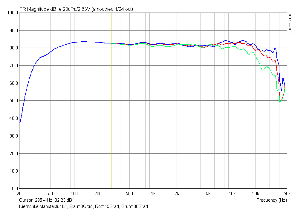 Bild 1: Frequenzgang auf Achse und unter Winkeln von 15 und 30 Grad (Original Messung mit nur 1/24 Oktave Glättung).